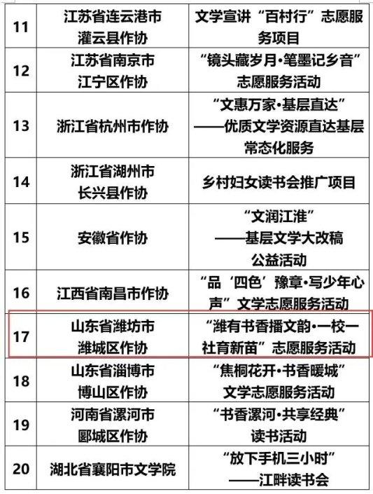 鲁网3月5日讯(记者 王玉龙)3月5日,中国作家协会社会联络部在中国作家网公布了2026年度文学志愿服务示范性重点扶持服务项目名单,全国共有52个项目入选。其中,潍坊市潍城区作协提报的“潍有书香播文韵•一校一社育新苗”志愿服务活动成功入选。这是潍坊市唯一的入选项目,也是全省入选的两个项目之一。