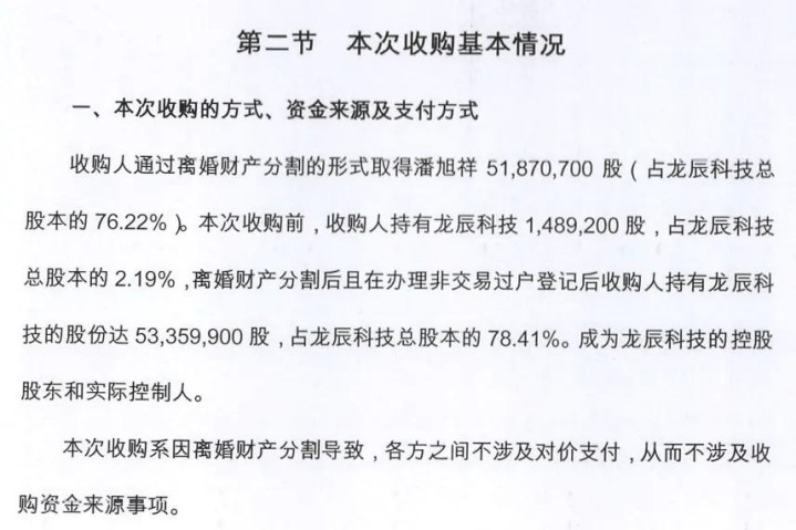 龙辰科技第一次巨变,发生在2017年5月,公司此前的实际控制人、董事长潘旭祥,与林美云签订《离婚协议》,前者将所持龙辰科技股份全部转让给林美云,使后者的持股比例达到78.41%。